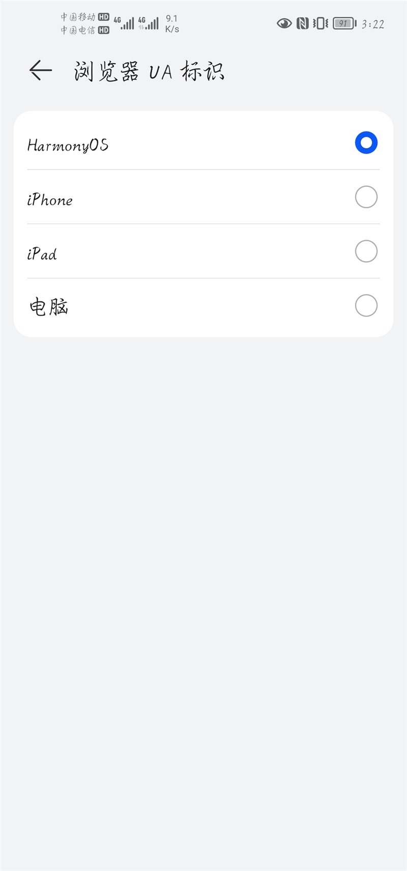 有用户发现,华为手机浏览器设置中的 UA 标识已经添加了 HarmonyOS,删除了安卓,另外还保留了 iPhone、iPad、电脑等标识选项。