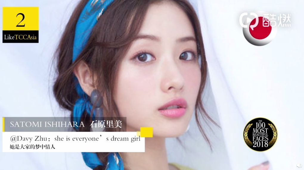 在今年3月份TCC公布的2018亚太区最美100张面孔中,石原里美位居第2,成为榜单中排名最高的日本女艺人