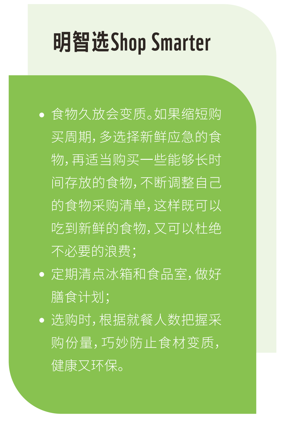 作为一名普通的消费者,要如何身体力行减少食物浪费呢?球球在菜谱中首先简单为大家总结了几条日常生活中易行的建议: