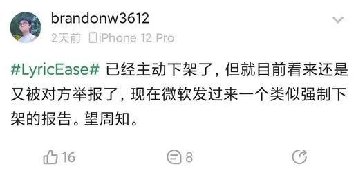 LyricEase 开发者 brandonw3612 表示,已经主动下架了 LyricEase,但应该是又被对方举报了,而且微软还发来了类似强制下架的报告。 另一位开发者 kengwang 表示,第三方网易云音乐 UWP 应用 Hyplayer 同样下架。 (来源:新浪科技)