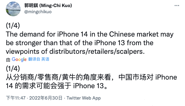分析师郭明錤的最新文章指出,从经销商和零售商的角度来看,中国市场对苹果iPhone 14系列的需求可能比iPhone 13系列更强。