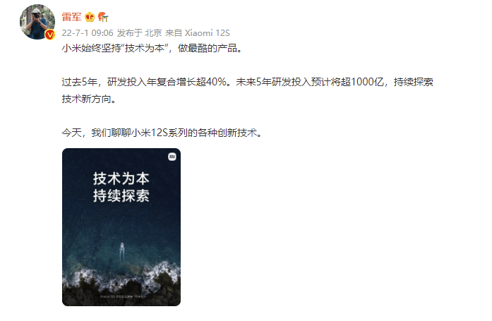小米董事长雷军在微博表示,过去 5 年,小米研发投入年复合增长超 40%。未来 5 年研发投入预计将超 1000 亿。