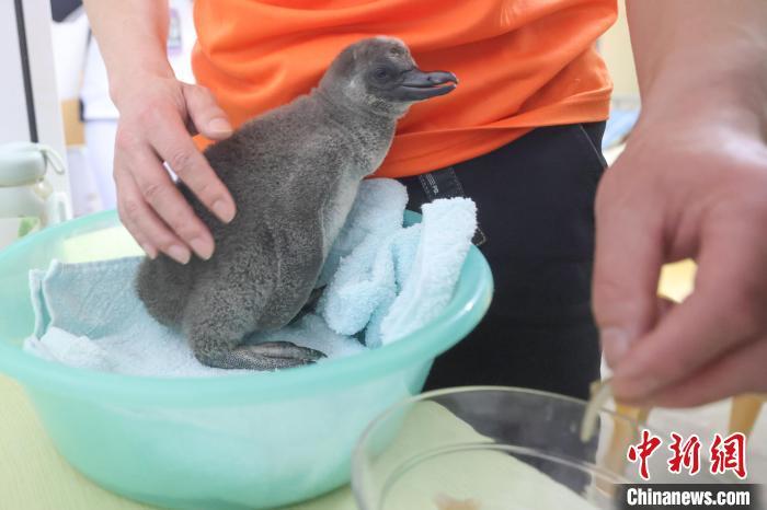3月17日,江苏南京,海底世界饲养员给新生的企鹅喂食。中新社记者 泱波 摄