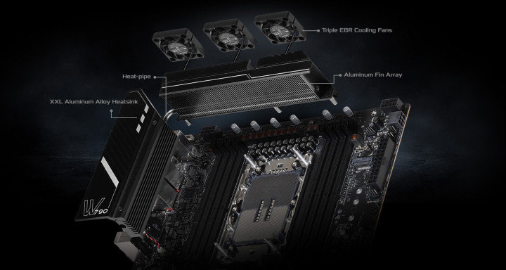 华擎确保Intel Xeon W-2400和W-3400系列处理器和DDR5内存在所有条件和系统负载下的VRM稳定性。其领先的VRM采用90ASPS的20+2相供电设计、Nichicon 12K黑色电容和服务器级电源扼流圈,搭配14层PCB设计,可防止PCB弯曲并确保信号完整性。VRM顶部拥有散热片和三个风扇,以及位于后IO上方的热管和铝合金散热器,可进一步散发热量。用户还可以在BIOS中手动调整风扇速度曲线以满足个人需求。