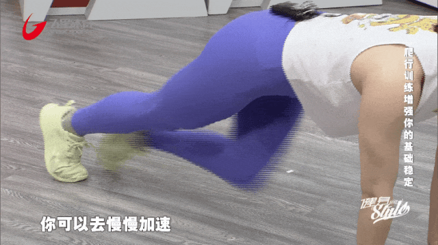 动作要点:爬行训练一般是通过慢速的训练去获得更好的控制,如果你想在训练中获得一些心率的提升,增加一些心肺的训练,那么可以去挑战登山跑。双手撑在肩膀的正下方,身体来到平板支撑,我们先从慢速开始学习动作,将一侧膝盖弯曲往前,保持身体稳定,腰背平直,再将脚往后蹬,回到平板支撑。在稳定的状态下,双脚交替进行。当腰背能够保持稳定的时候,我们尝试加速,想象腰背部有一碗水,尽量不将水洒出来,让我们交替将弯曲的膝盖往前,提升我们的心率。