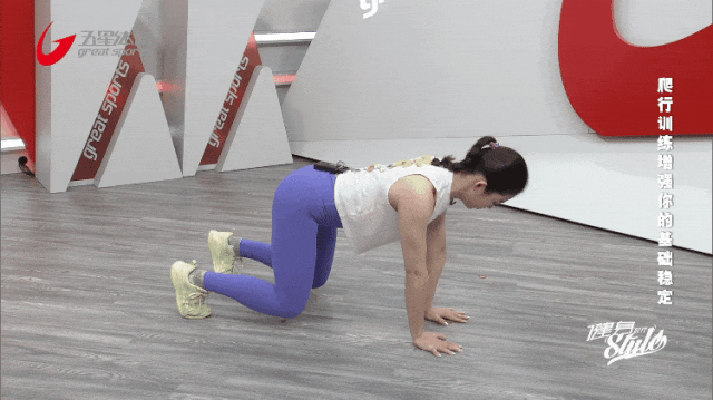 动作要点:双手向后,双脚膝盖弯曲,双脚和双手支撑整个身体,双臂伸直,一侧手和对侧脚同时抬起向前迈进,手指可以往向前或者向后,保持臀部的高度,把身体始终保持撑住推开地面的感觉。如果想增加难度,可以尝试将臀部抬高,保持臀部的高度,夹紧臀部,整个躯干像小凳子一样,想象身上放了一碗汤,尽量不要让汤洒出来,同样一侧手和对侧脚同时抬起往前往后移动。