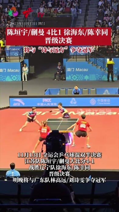 11月13日,全运会乒乓球混双半决赛在澳门进行,江苏队陈垣宇/蒯曼大比分4-1战胜辽宁队徐海东/陈幸同,晋级决赛。明晚将与广东队林高远/刘诗雯争夺冠军。(记者陈咏珂)