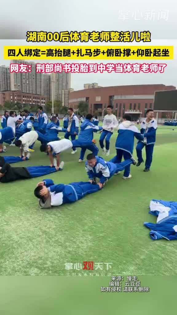 湖南00后体育老师整活儿啦!四人绑定=高抬腿+扎马步+俯卧撑+仰卧起坐,主打一人偷懒,全队“歇菜”