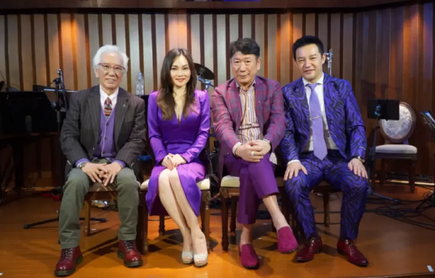 主创成员(从左到右)作词家荒木、歌手紫丽、作曲家中島薫、制作人半泽龙之介