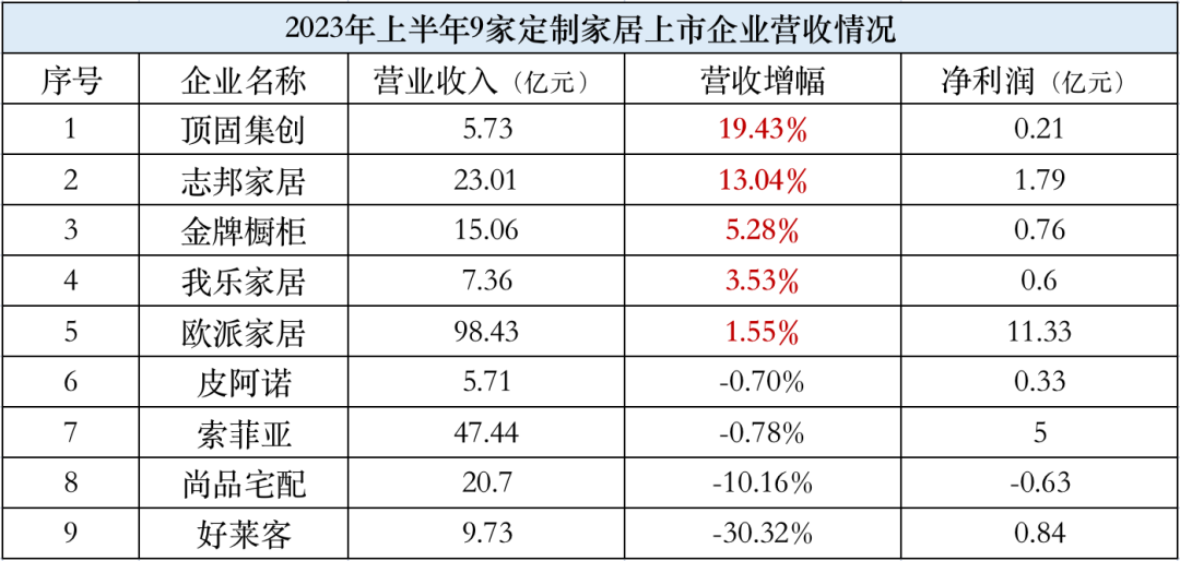 共计5家营收或净利同比增长,其中欧派以11.33亿元的净利润遥遥领先