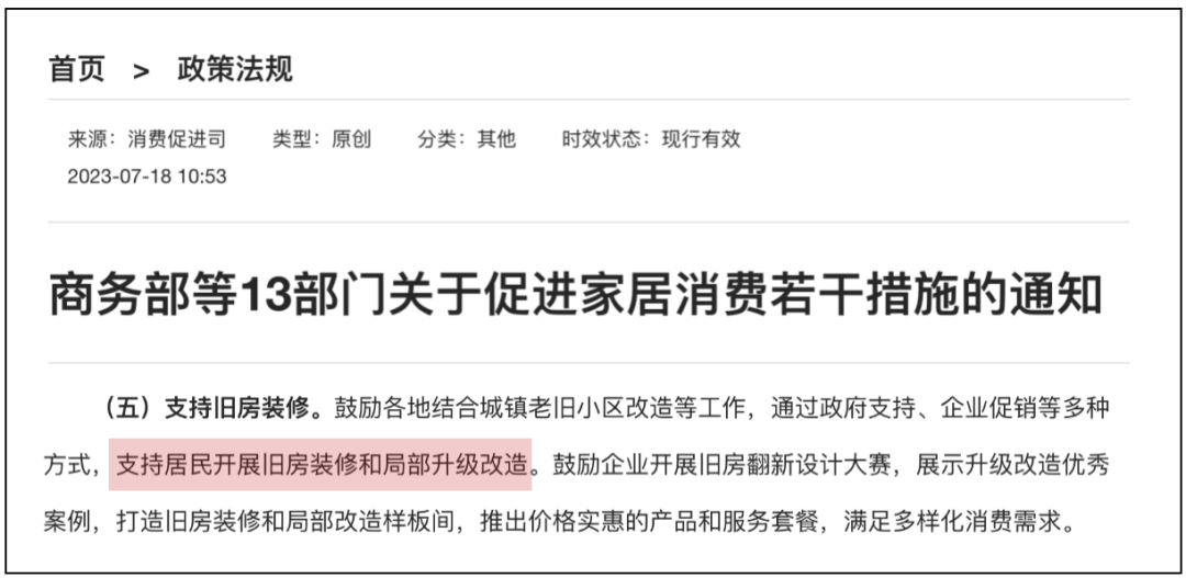 包括今年7月国家发布的《关于促进家居消费的若干措施》