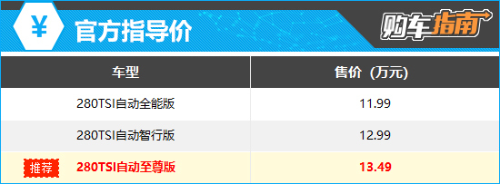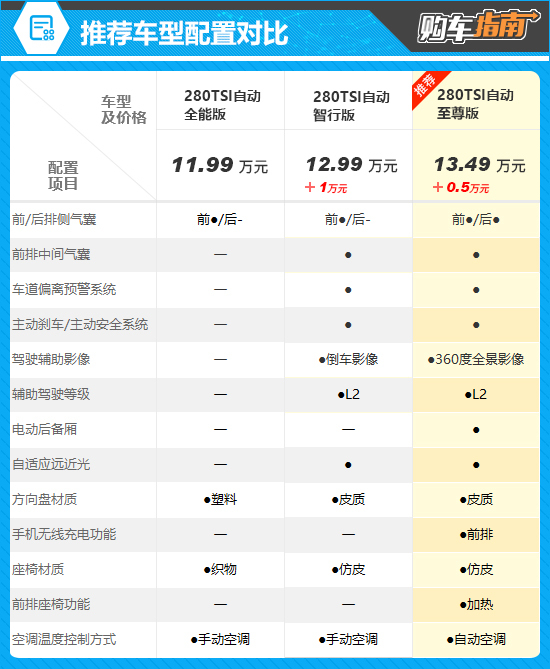 不过,推荐车型的性价比更高。其较280TSI自动智行版多出了后排侧气囊、电动后备厢、前排手机无线充电、前排座椅加热功能,倒车影像也升级为360度全景影像,手动空调则升级为自动空调,整体用车体验会有大幅提升,售价仅需再增加0.5万元,可谓物超所值。