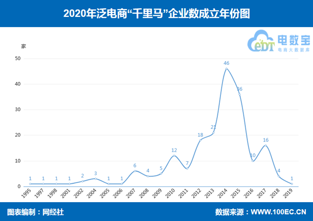 《报告》显示,“泛电商”千里马成立时间主要集中在2010年至2017年,其中2014年成立数最多,达46家;其次为2015年36家。
