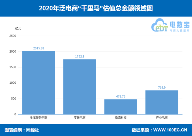 领域分布上,2020年共有32家产业电商入选泛电商“千里马”,占总数16.24%;估值763.9亿元,占泛电商“千里马”总估值的15.25%。零售电商共有65家入选泛电商“千里马”榜单,占总数33%;估值1752.8亿元,占总估值的34.98%。生活服务电商有83家入选泛电商“千里马”榜单,占泛电商“千里马”总数42.13%;估值2015.38亿元,占总估值的40.22%。物流科技有17家入选泛电商“千里马”榜单,占总数8.63%;估值478.75亿元,占总估值的9.55%。