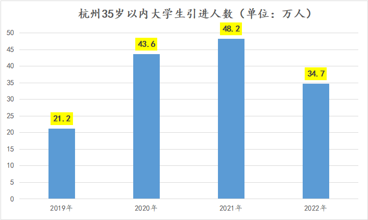 2020年当年,杭州招引35岁以下大学生43.6万人,2021年招引48.3万人,2022年招引36.4万人,三年合计招引128.3万人,远超100万的目标