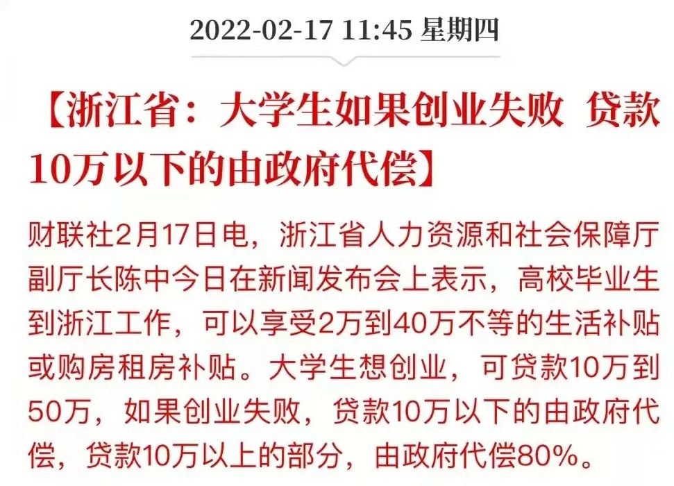 可能这也是为什么浙江喊话大学生创业失败,政府兜底这种事,目前只发生在浙江