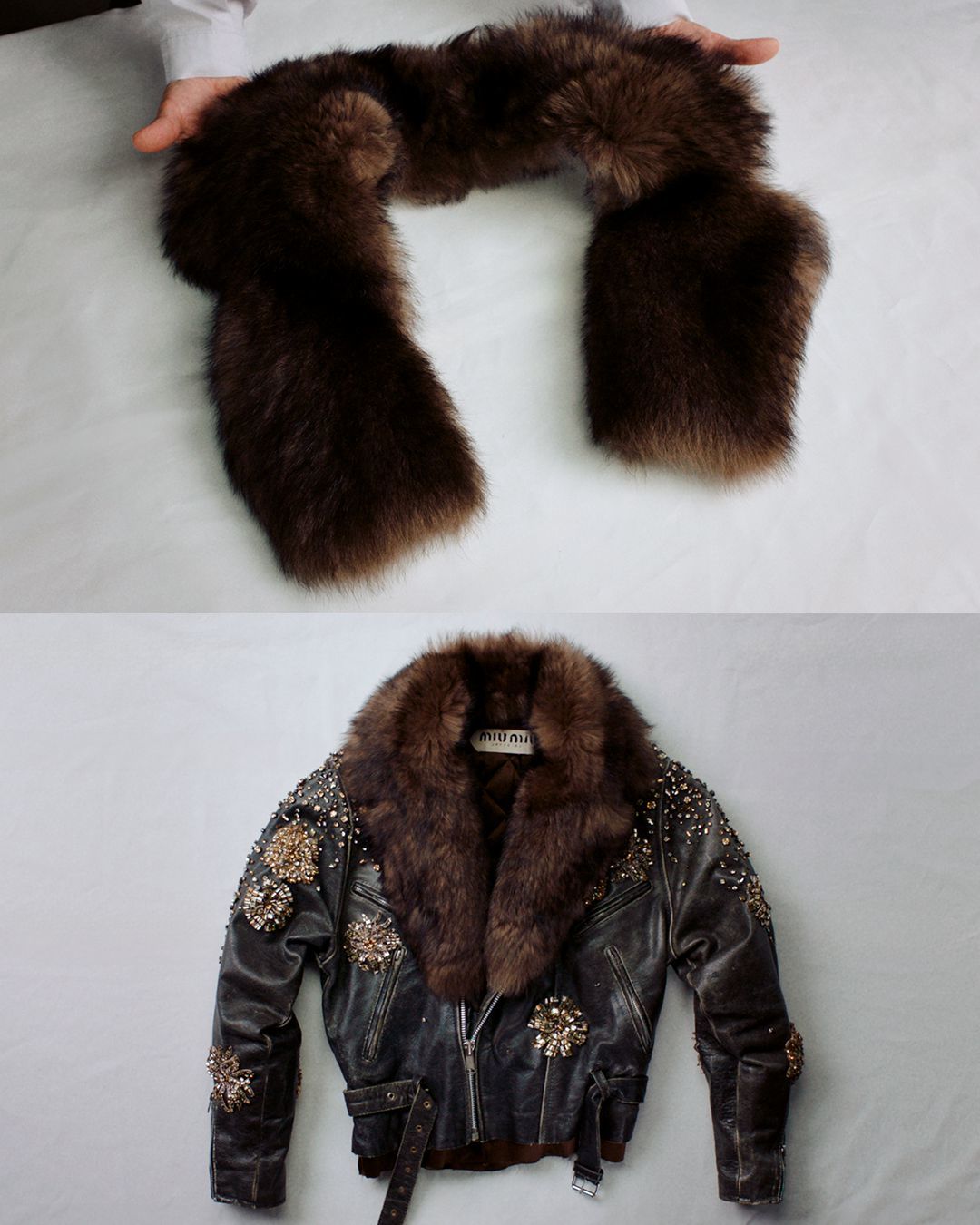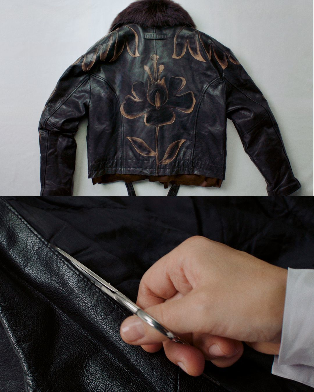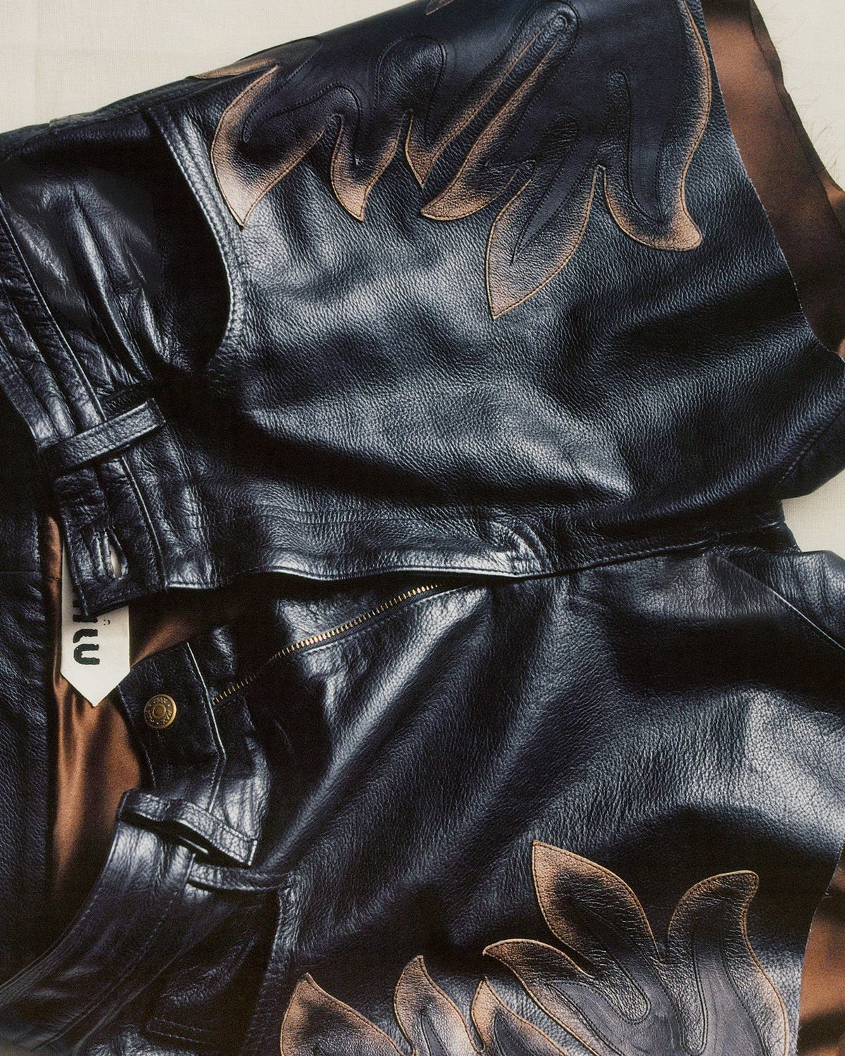 Miu Miu“Upcycled皮革”于2022秋冬季首度亮相,而在2024系列中,品牌呈现了复古机车夹克搭配经典短裤与迷你半身裙,拼接品牌标志性面料,缀饰灵感源于Miu Miu 2011春夏时装秀的花卉与火焰图案,与2024秋冬系列的珠宝刺绣相呼应。夹克经过巧妙解构与重塑,内衬搭配丝缎,绗缝胸襟,辅以可拆卸柔软羊皮毛衣领。拉链位置重新设计,让下摆呈自然的散边,Miu Miu徽标点缀衣身。
