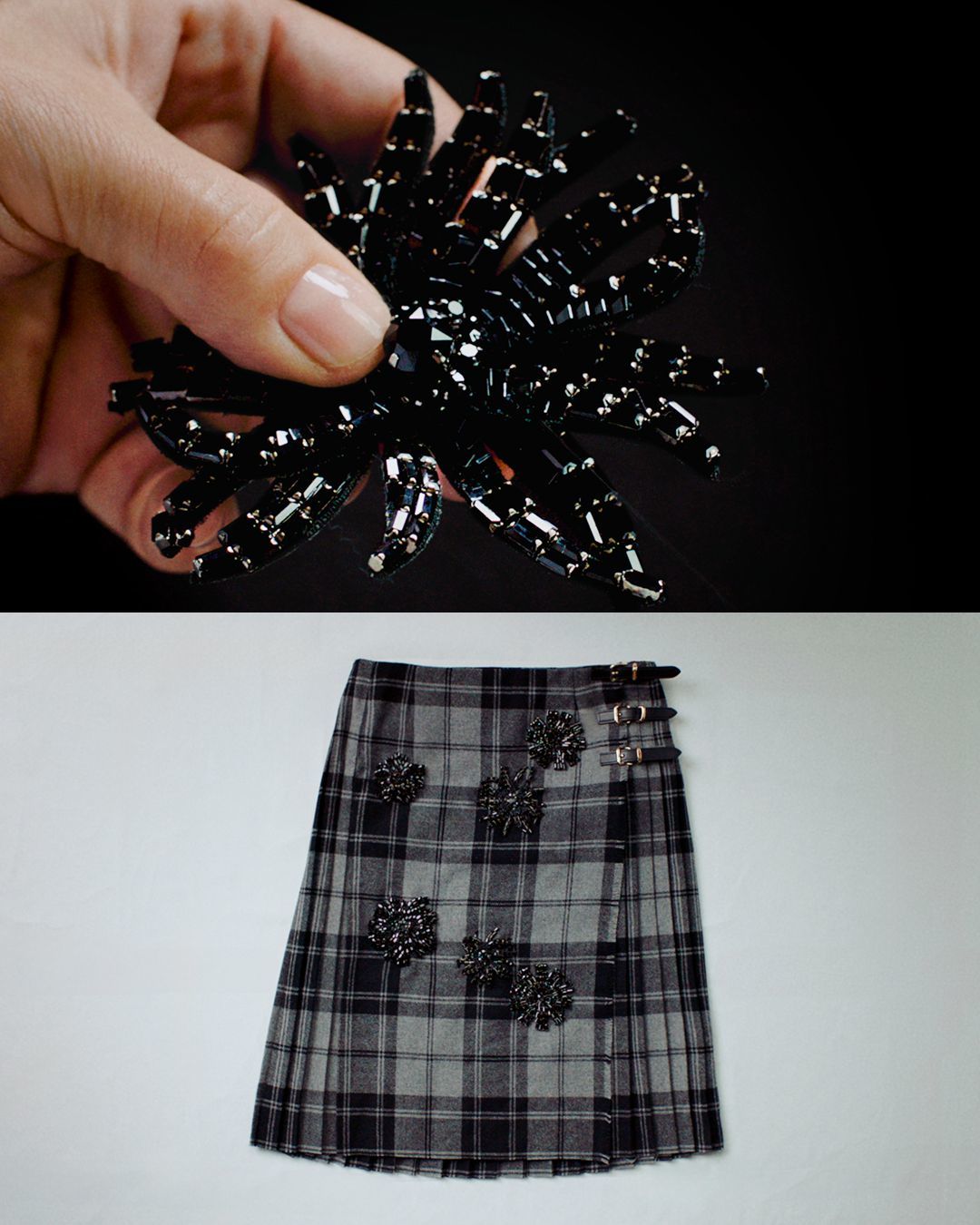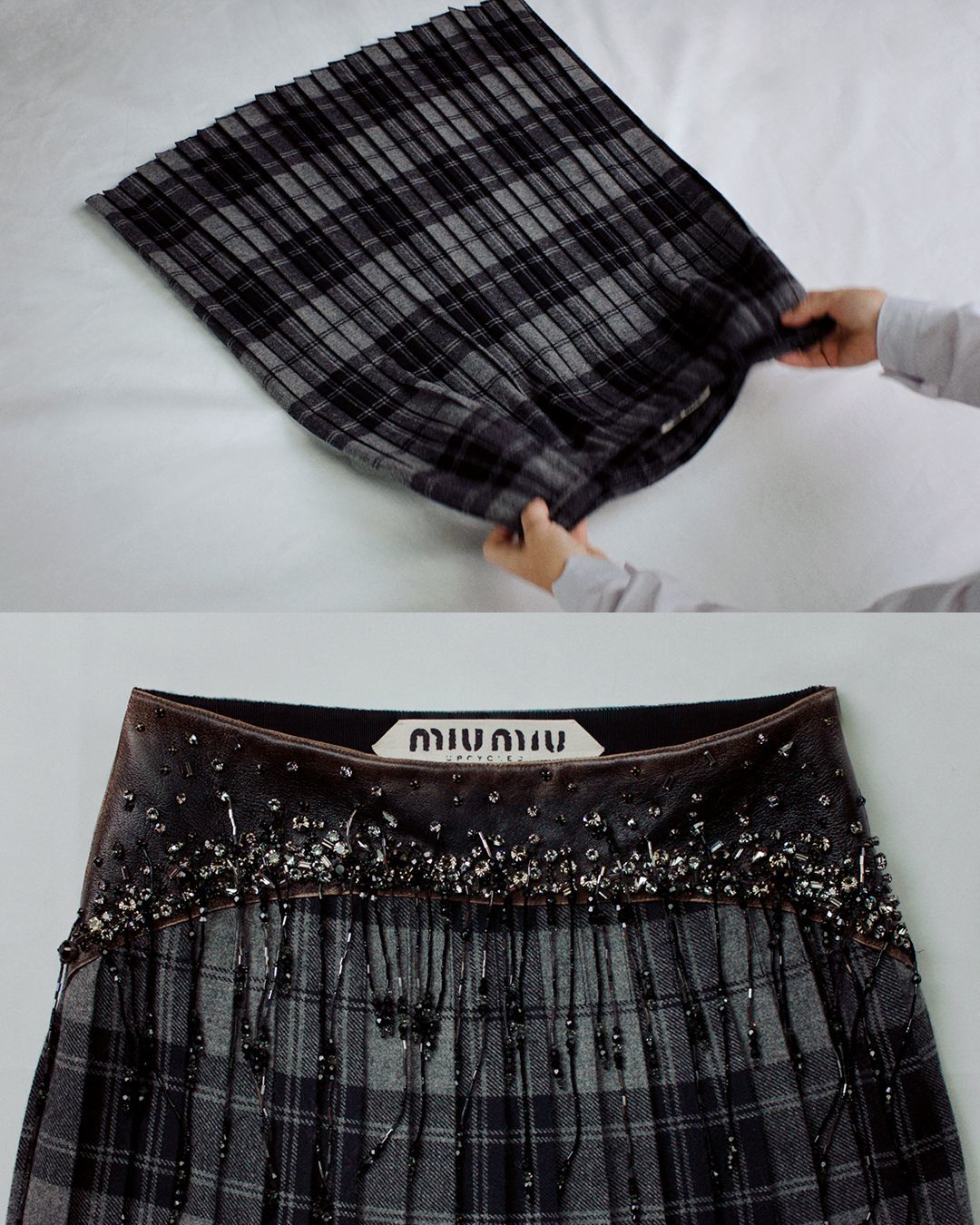 Miu Miu“Upcycled褶裙”取自各式苏格兰格纹,叠加黑色错视图案或手工刺绣渐变琢面宝石。低腰设计配搭新意皮革腰片,重塑曼妙比例。