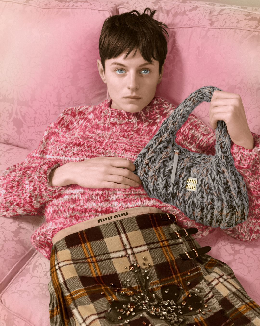Miu Miu“Upcycled纱线”化身手工针织混色羊毛,囊括厚款圆领连帽衫、围巾与精巧配饰,以棉质钩编Miu Miu徽标为点睛之笔。Wander手袋与针织拖鞋为此前卫叛逆系列注入别样魅力。