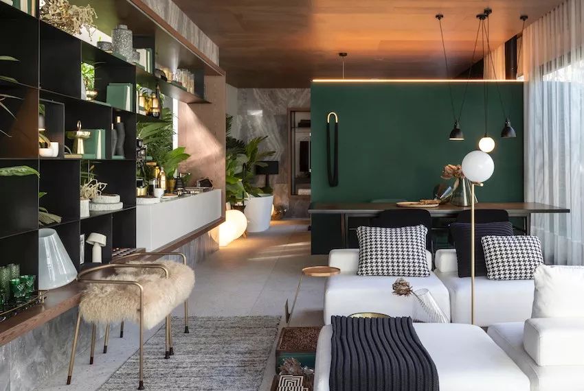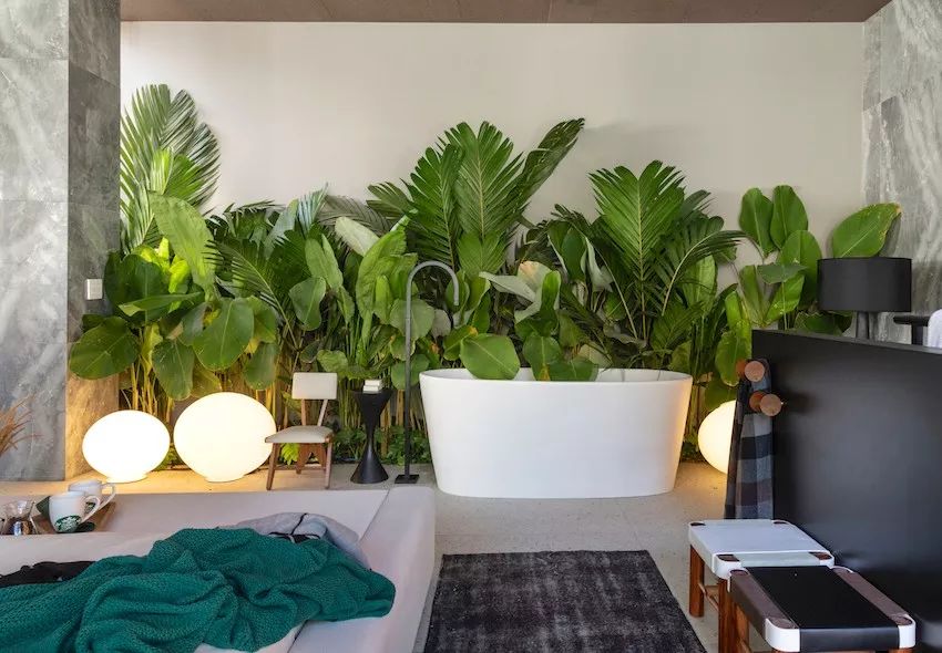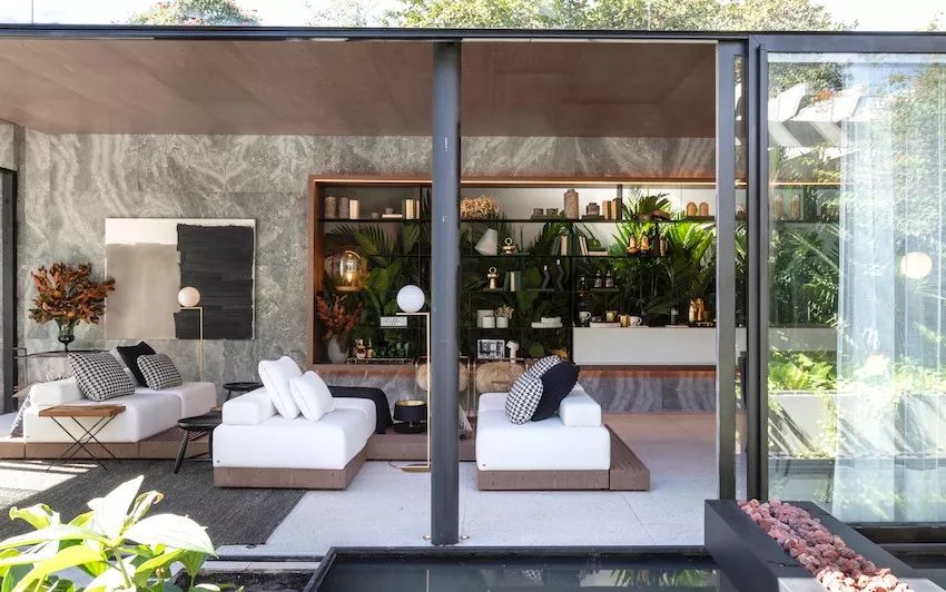 Très Arquitetura 设计团队将巴西这间旧谷仓重新翻新为具度假感的现代居宅,整个空间以丛林绿贯穿做为主色系,并以木建材天花板搭配大器纹路的石材壁面,捏塑天然质朴之美,布置许多大面积的植栽点缀空间,最吸睛的莫过于客厅的植栽陈列柜。