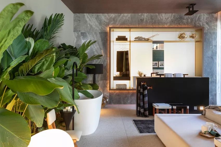 以木建材和铁件框构出不规则的开放式柜体,篓空设计让背后一整面的绿意植栽成为视觉焦点,加上具金属质感的装饰品,散发现代又不失度假气息的氛围。