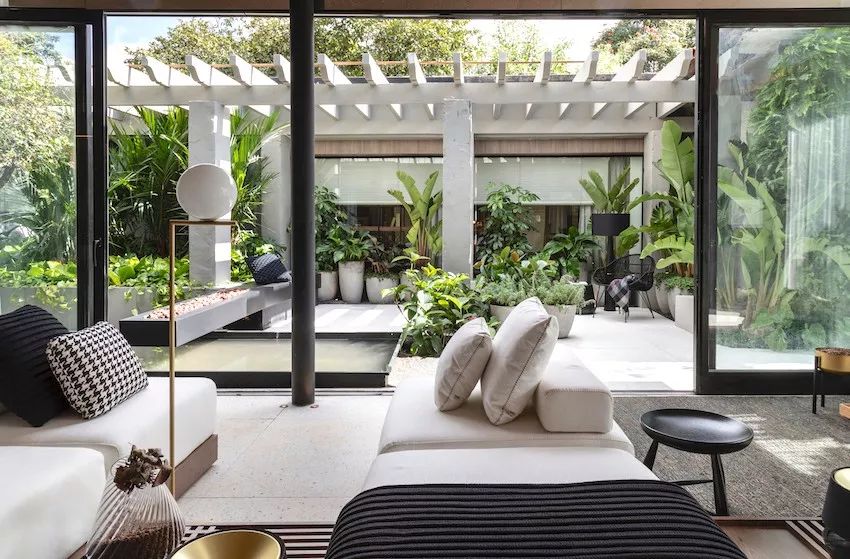 以大面积落地玻璃环绕四周取代实体墙面,不仅引光景入室、形塑通透敞朗的空间感,更模糊室内外界线,与占地广大的庭院仅一步之遥,做为室内空间主轴的绿意植栽延伸至户外,打造度假感十足的休憩氛围。