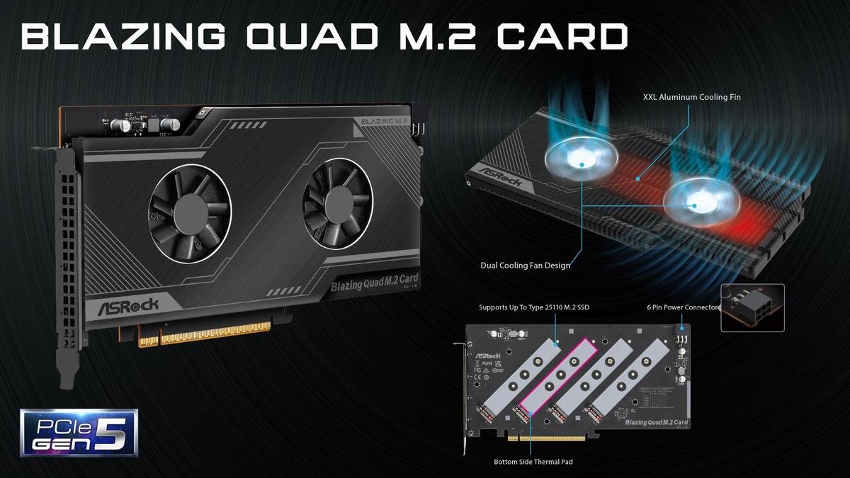 华擎W790 WS主板还支持安装Blazing Quad M.2 SSD PCI-Express x16扩展卡,可为主板提供更多M.2插槽。扩展卡尺寸为24.4x12.6cm,采用双风扇散热设计,拥有四个PCIe 5.0 x4 M.2插槽,均为22110规格。每个M.2插槽配备状态指示灯,扩展卡供电接口为6Pin。