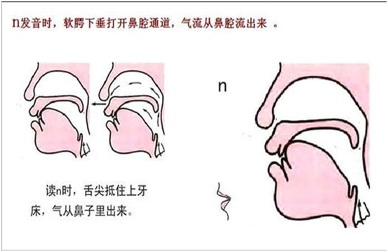 读N音时,舌尖及舌前部多个先与口腔前上部完全闭合,然后慢慢离开,气流从鼻腔出来,音色比较沉闷;需要注意的是这个声母在近似即将结束时,舌尖微微地离开上牙龈,让气流从口腔出来。