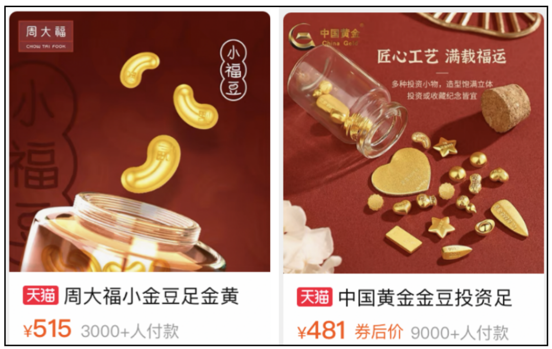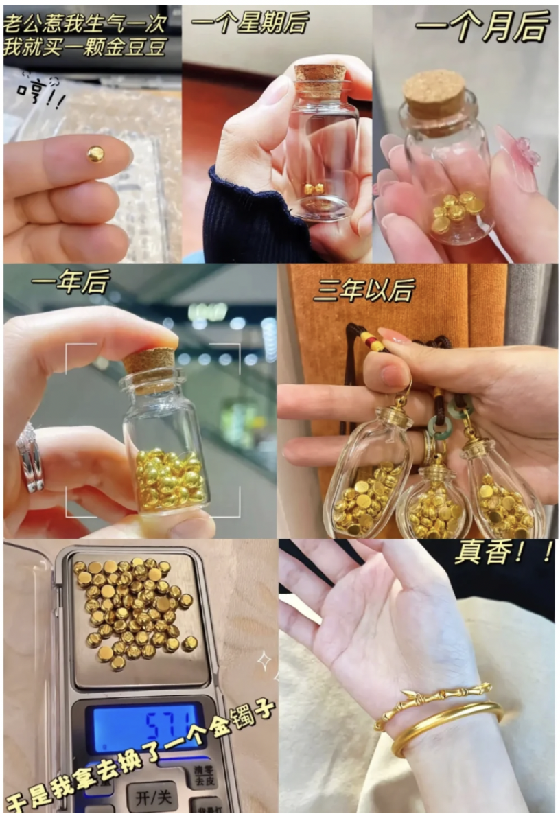 相比在市场上多家门店逼近每克600元的高价,越来越多的年轻人,开始购买这样一种产品:金豆豆