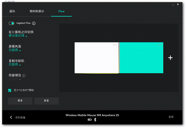 设置方面,如果需要体验Flow功能是需要满足两个条件的。1、需要在两台处在同一 Wi-Fi 电脑(支持Windows与Mac系统);2、两台电脑上都要安装 LOGITECH OPTIONS并分别配对鼠标,然后打开 FLOW 的配对功能即可。设置之后就可以使用了。使用上可以根据需要调整两台设备的位置。比如我一般是笔记本和台式机同步使用,所以把屏幕调整成上下摆放更舒服一些。