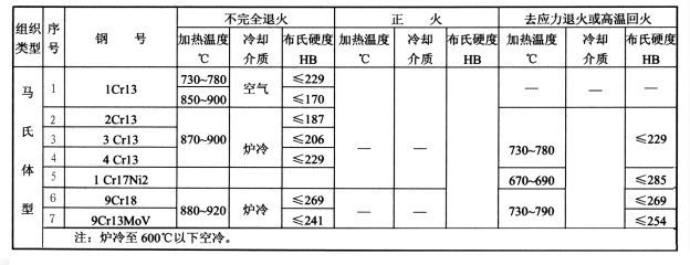 答:马氏体型不锈钢有Cr13型(低碳和中碳)、Cr17Ni型(低碳)、Cr18型(高碳),其热处理工艺包括退火、淬火+回火,去应力等。