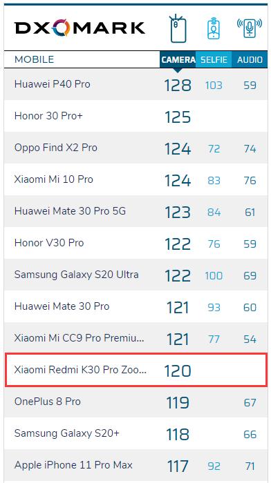 近日上架的Redmi K30 Pro变焦版在DxOMark取得120分的好成绩,其中,拍照部分得分是129分,视频部分得分是101分,成功跻身前十。比小米CC9 Pro尊享版低1分,比一加8 Pro高1分,同时超过了三星Galaxy S20+和iPhone 11 Pro Max。