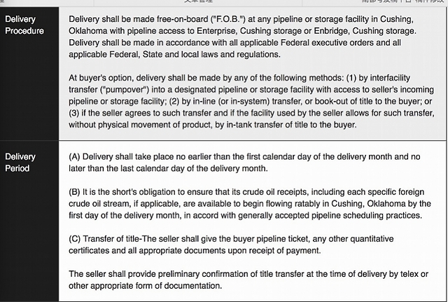 交割程序:交割应根据船上交货价或离岸价(Free-on-board,F.O.B),并可使用俄克拉荷马州库欣的任何管道或存储设施连接诶Enterprise 库欣存储或Enbridge库欣存储。