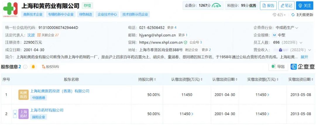 该公司成立于2001年,上海医药与和黄医药各持股50%,是上海首家中药合资企业。