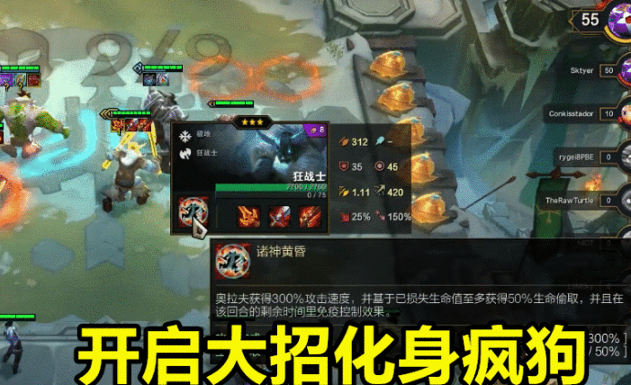 再加上奥拉夫这个狂战士的属性,狂战士在攻击的时候是有几率能够造成顺劈的效果,也就是会对目标身后的敌人造成伤害,并且伤害是100%,这也让开启大招之后的奥拉夫,能够拥有非常高的AOE伤害。所以最好是要给奥拉夫搭配上6狂战,这样触发效果的几率会变得非常高。