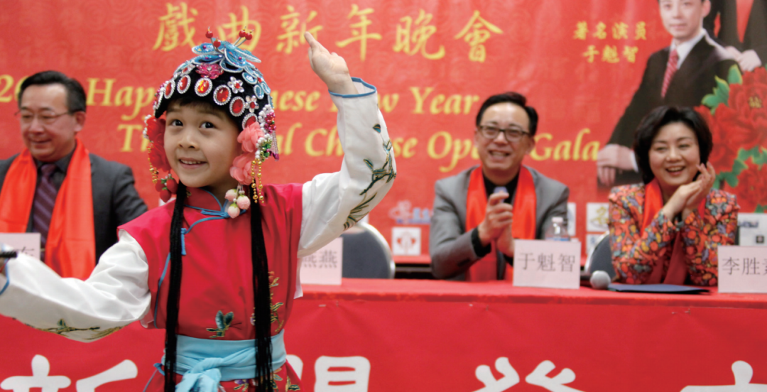 于魁智(右二)、李胜素(右一)赴加拿大演出期间,在与多伦多戏迷及媒体的见面会上,为当地小票友的现场表演喝彩(图:中新社)