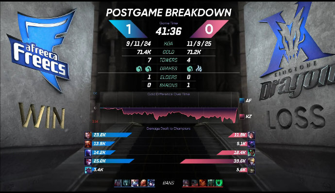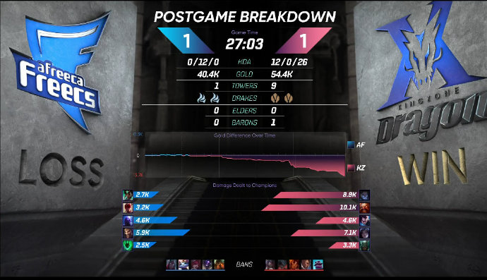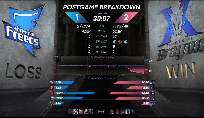 18分钟,双方在下路河道爆发团战,KZ打出一波2换5团灭AF奠定胜局随即控下水龙并推掉中路一塔;