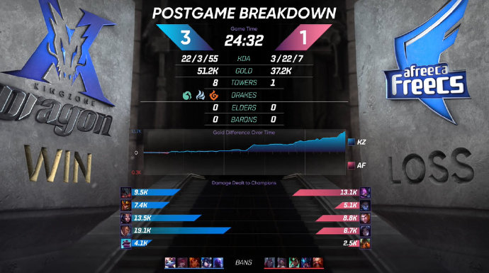 23分钟,KZ一波团灭AF随即一波结束比赛。