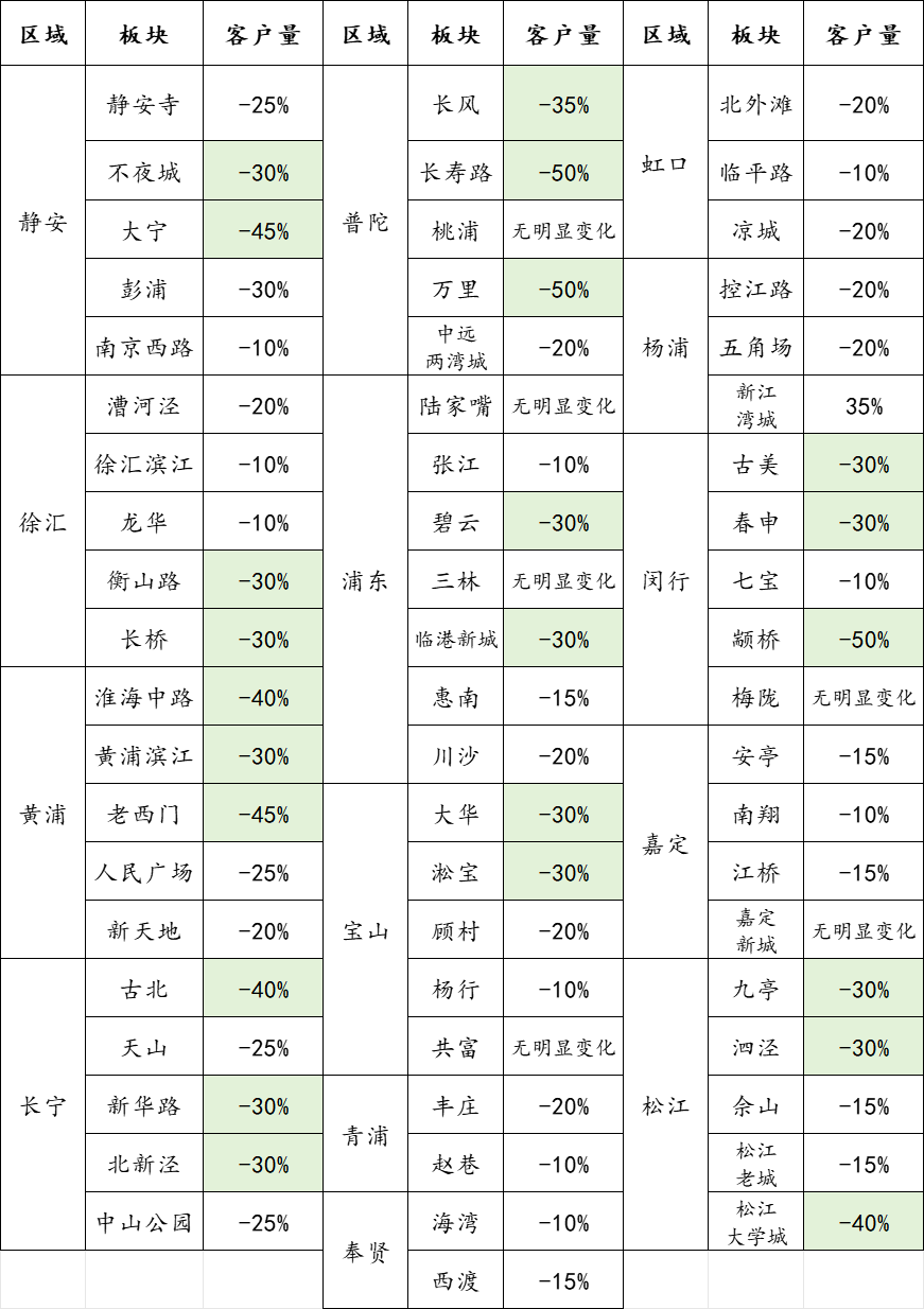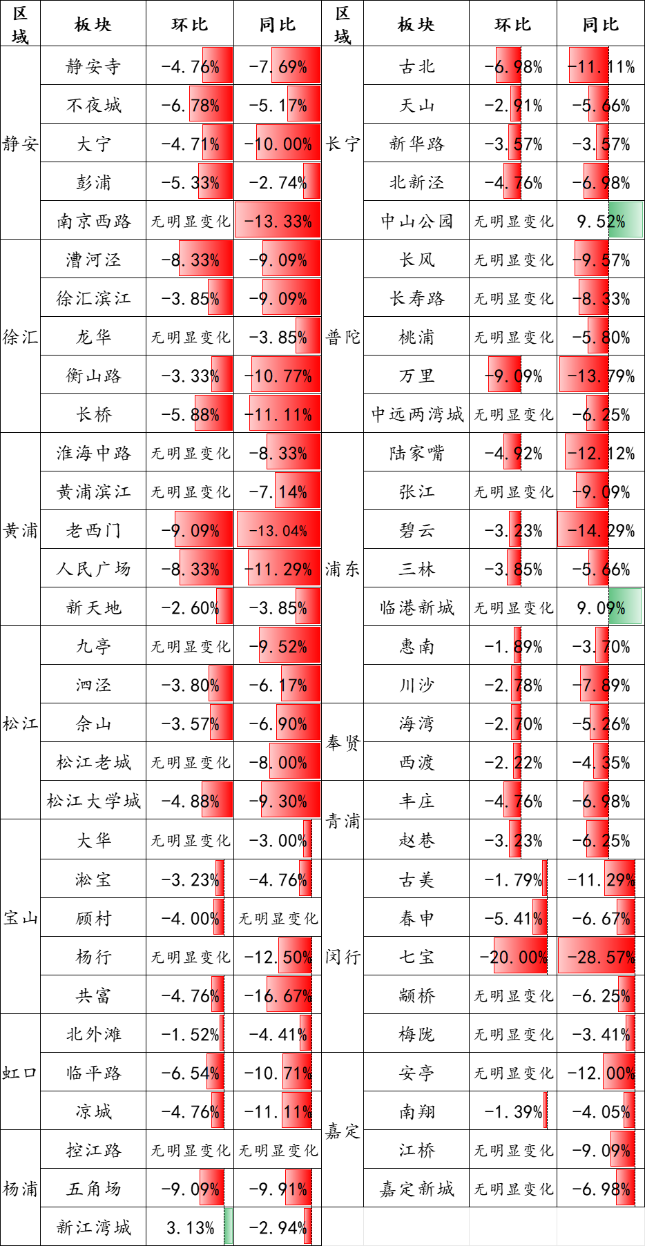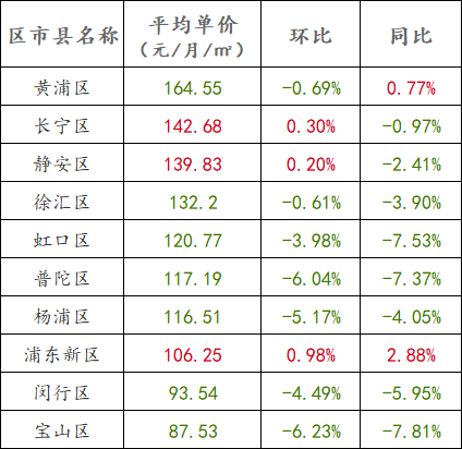 除了长宁、静安、浦东,其他各区租金环比上月都有不同程度下浮
