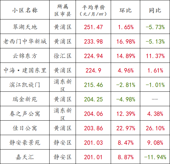 佳日公寓租金环比涨幅20%;老西门中华新城、云锦东方环比涨幅15%