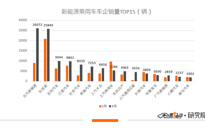 6月车企销量排行版的冠军终于易主,凭借EU系列单车销量近两万辆的支持以及EC系列环比2096.3%的爆发式增长,北汽新能源以26072辆总销量的微弱优势超越比亚迪排名第一。