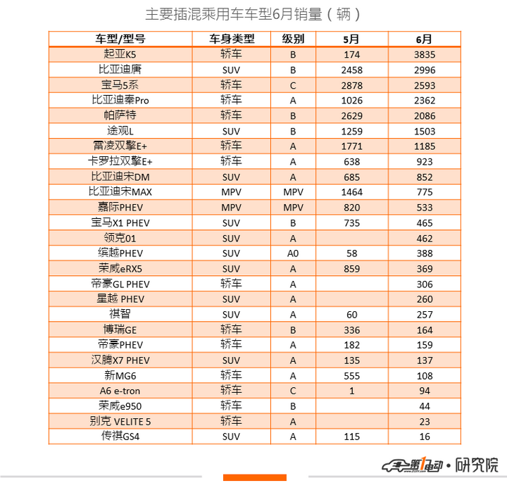 5月插混市场的TOP10车型中,只有4款合资品牌车型,而在6月TOP10中已经有6款合资车型。6款车型份额在TOP10中也占据了63.4%,起亚K5的销量更是接近4000辆,领先第二名唐DM 839辆,表现十分抢眼。