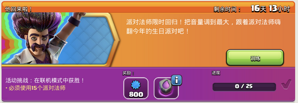 部落冲突这款游戏,在平衡性方面也是比较考究的。派对法师拥有更强劲的攻击力,相同的训练费用、训练时间,所以血量相对而言被削减了不少。因此对玩家们的下兵时机、英雄兵种的路线预判也有更高的要求。返场期间,联机模式中至少使用15个派对法师,获胜场次达到15场,就可以轻松领取一个圣水符石和800经验。白嫖的圣水符石,还是比较香的。