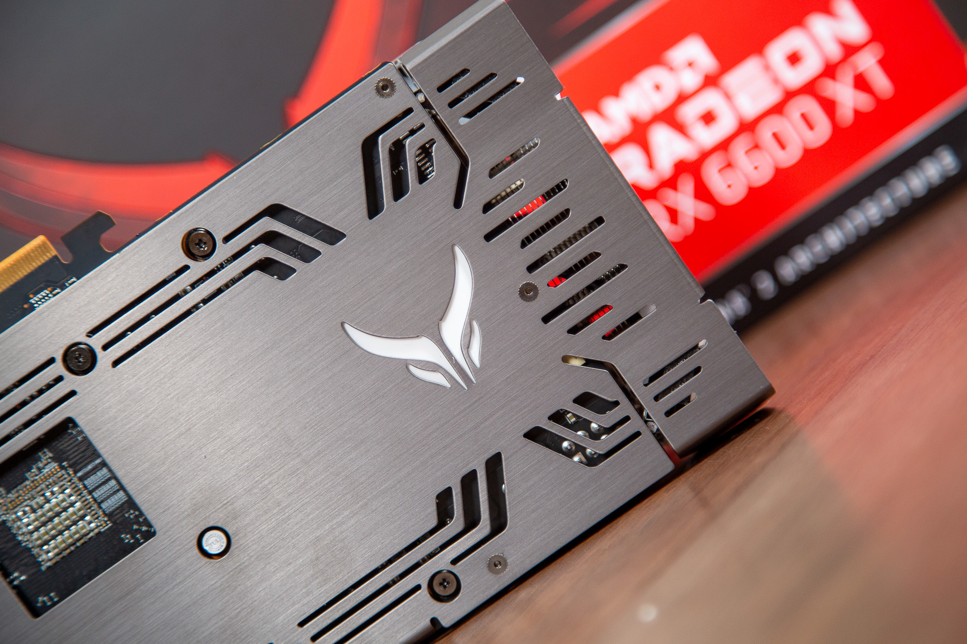 作为甜品级显卡,PowerColor撼讯 Red Devil 系列 RX 6600XT一样为玩家设计了金属背板。背板上的Devil恶魔logo还支持发光设计。整体在灯光方面可玩性还是很强的。