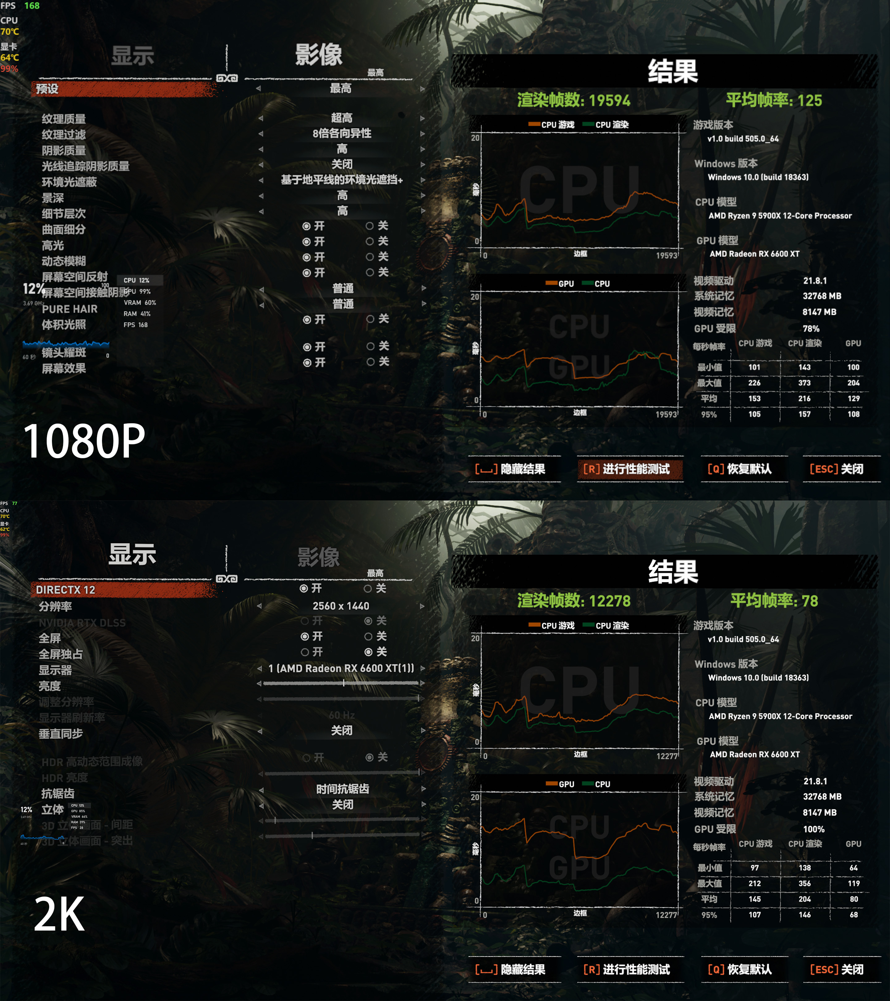 在《古墓丽影》这款游戏上可以看到在1080P超高画质下运行自定义最高画质后平均帧数为125帧,在更改分辨为2560*1440后测试游戏帧数为78帧。