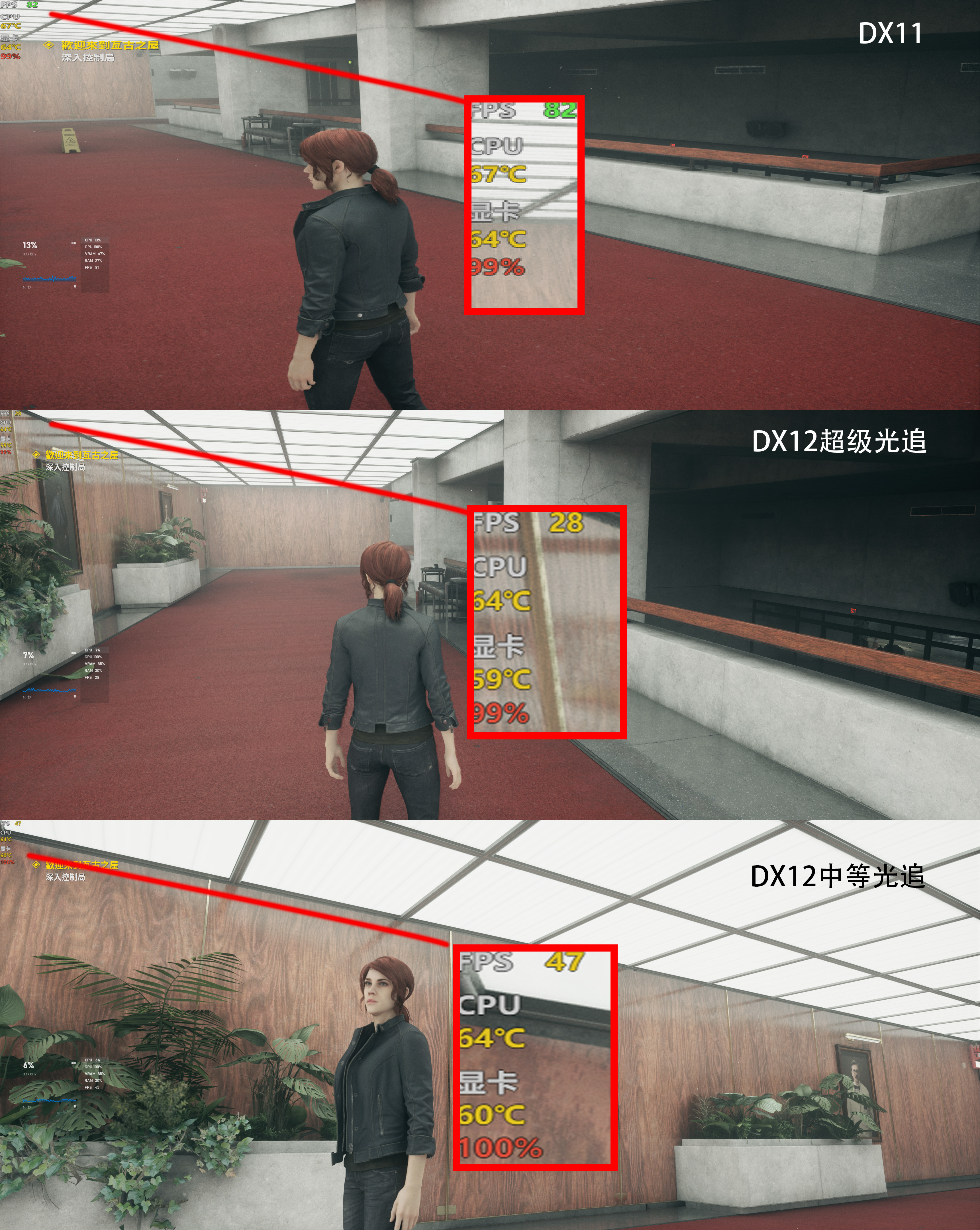 《控制》在1080P分辨率下开启高画质游戏,使用6600XT在最高画质下帧数在82帧上下,在选择选择DX12进入游戏选择在最高画质下开启超级光追后帧数掉到了28帧,不过好在AMD显卡在控制这款游戏中也支持开启光追。在把光追效果降到中等后游戏帧数回到了47帧上下。
