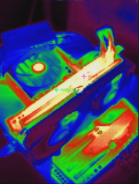 通过红外热成像仪可以看到显卡在烤机时显卡侧面出风口位置最高温度66.2℃,核心区域位置温度63.6℃整体发热如图。
