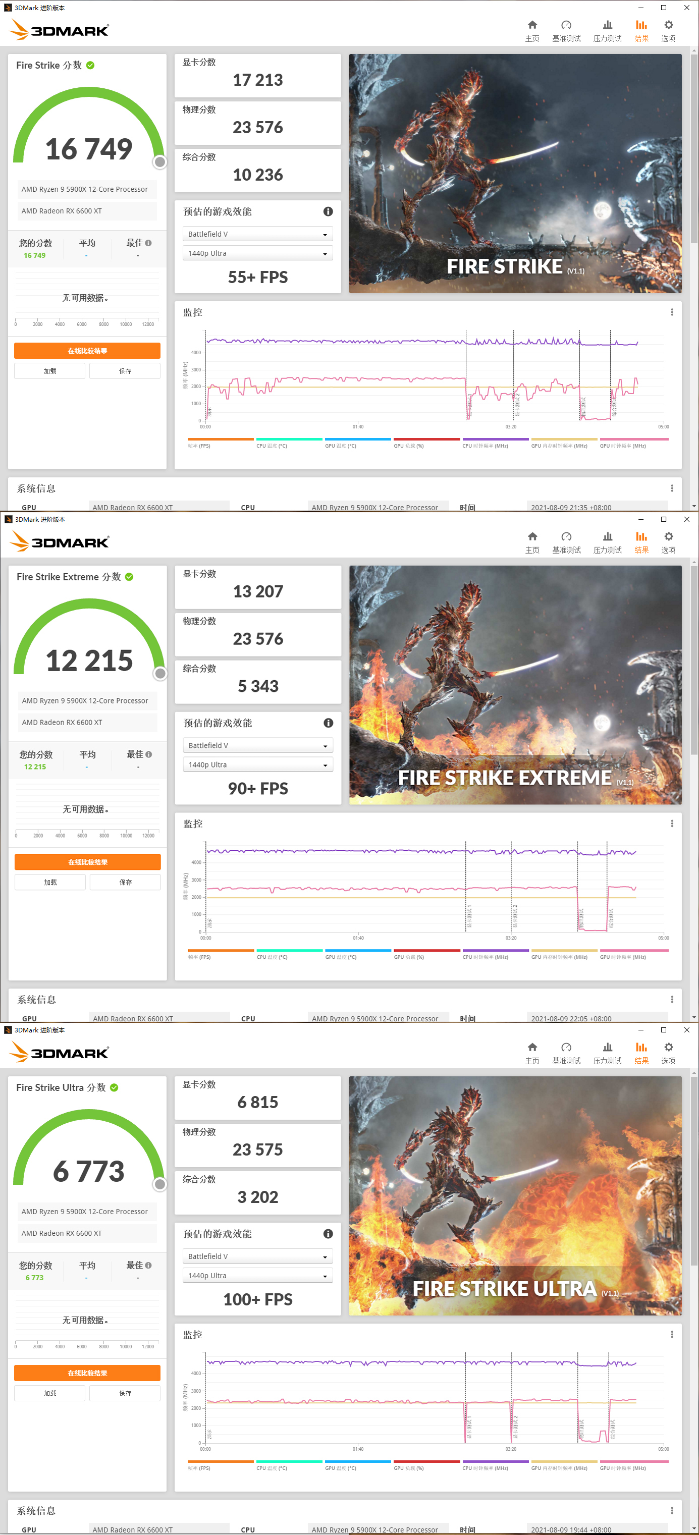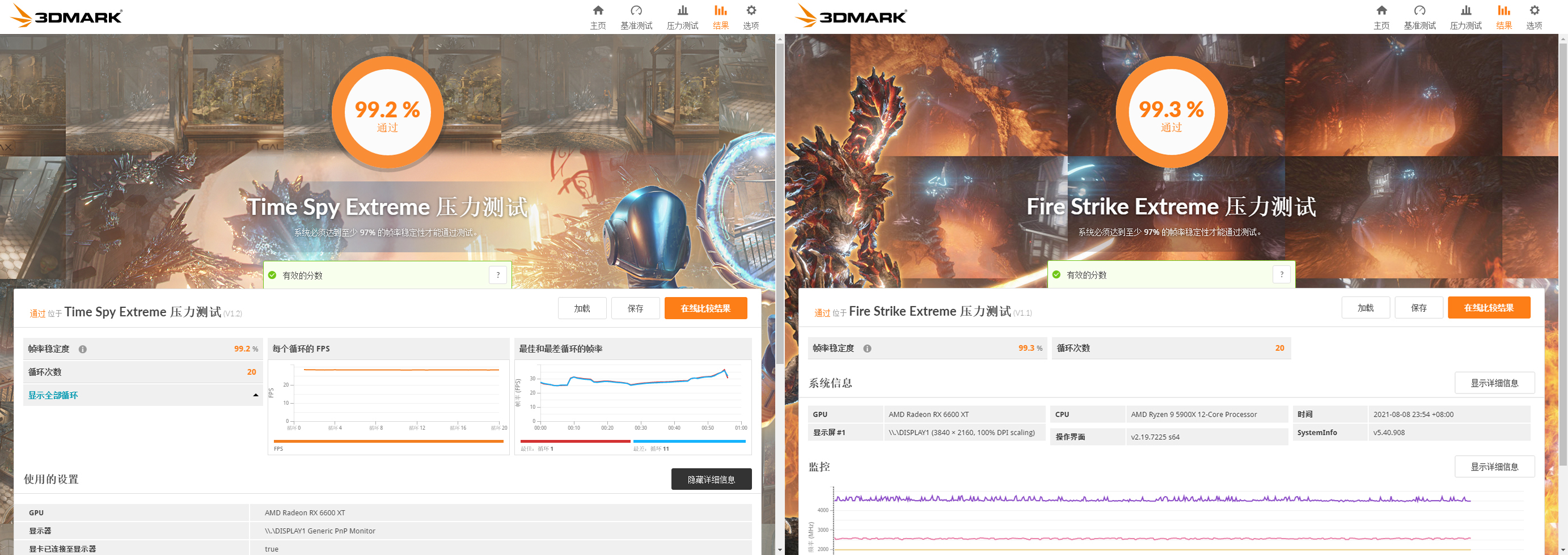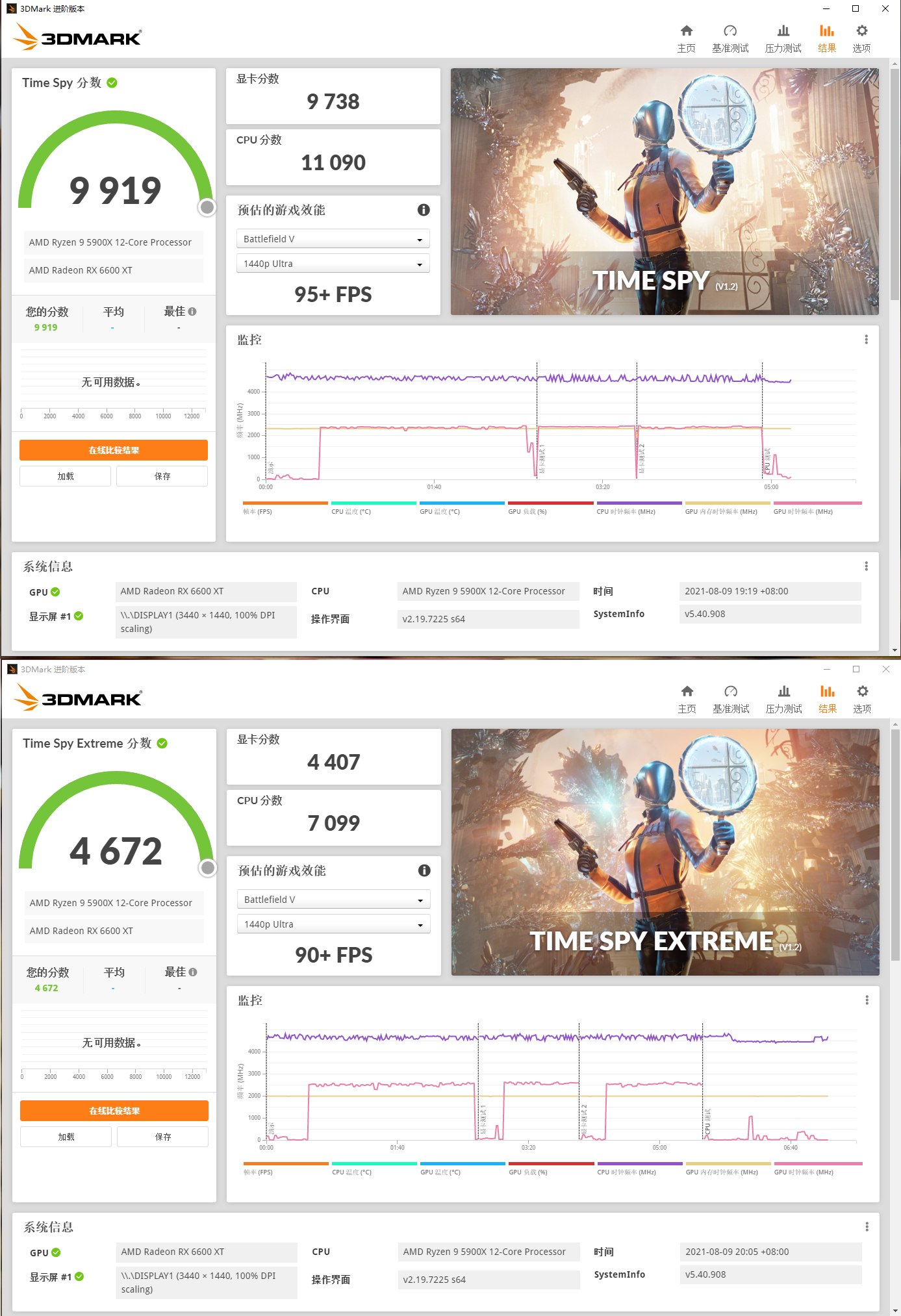 测试方面首先是3D Mark性能测试,在测试DirectX 12表现的Time Spy和Time Spy Extreme测试中可以看到RX 6600XT Red Devil的显卡得分为9738和4407。