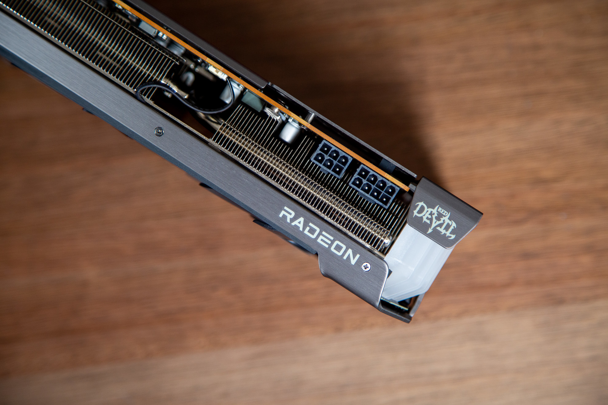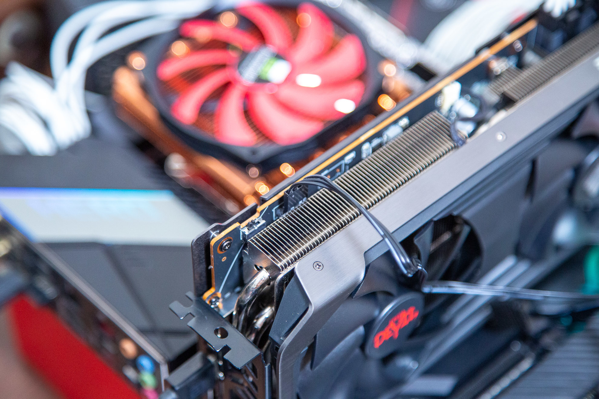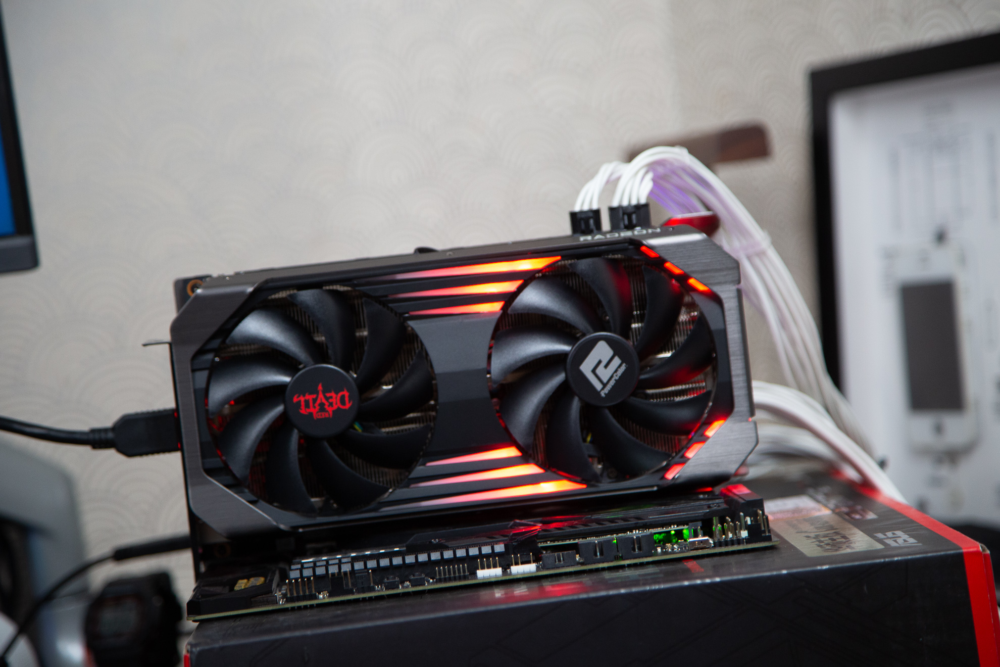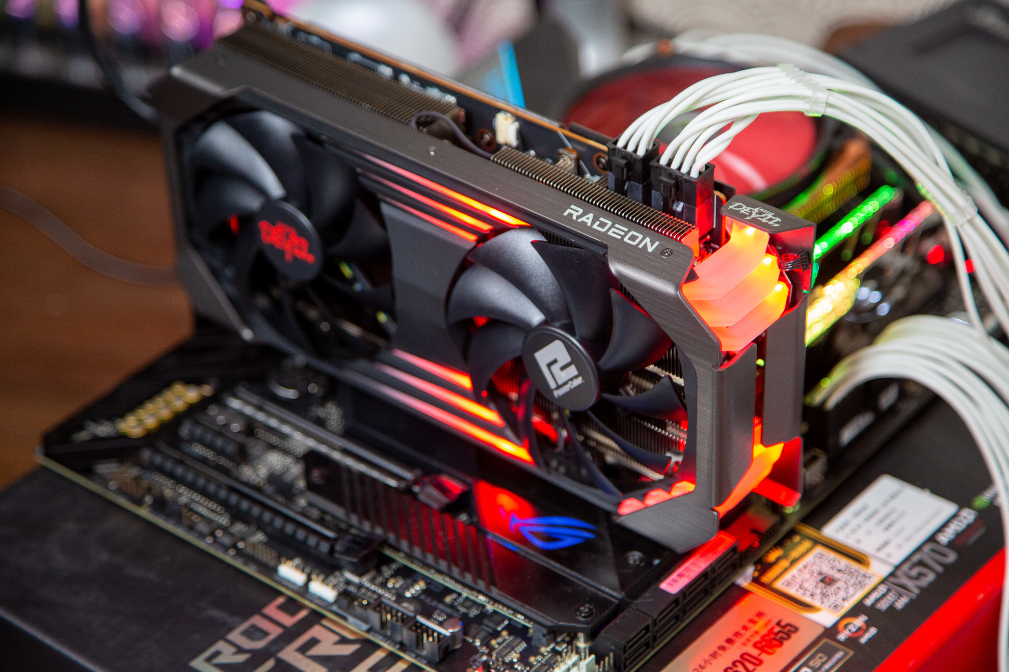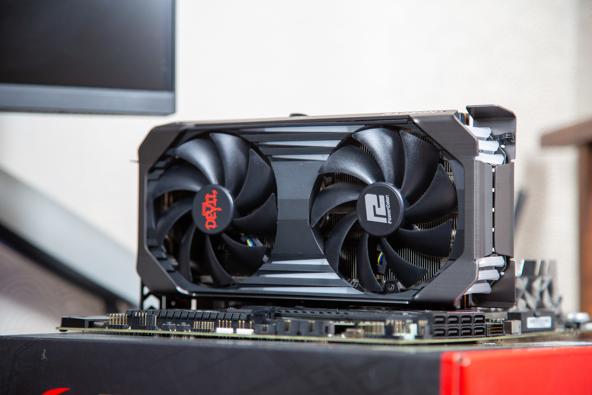 通电之后RX 6600XT Red Devil 可以看到其红色的灯效也是贯穿了显卡整体,相比很多无光的AMD显卡来讲。RX 6600XT Red Devil 的灯光部分可以说是另一种味道吧。
