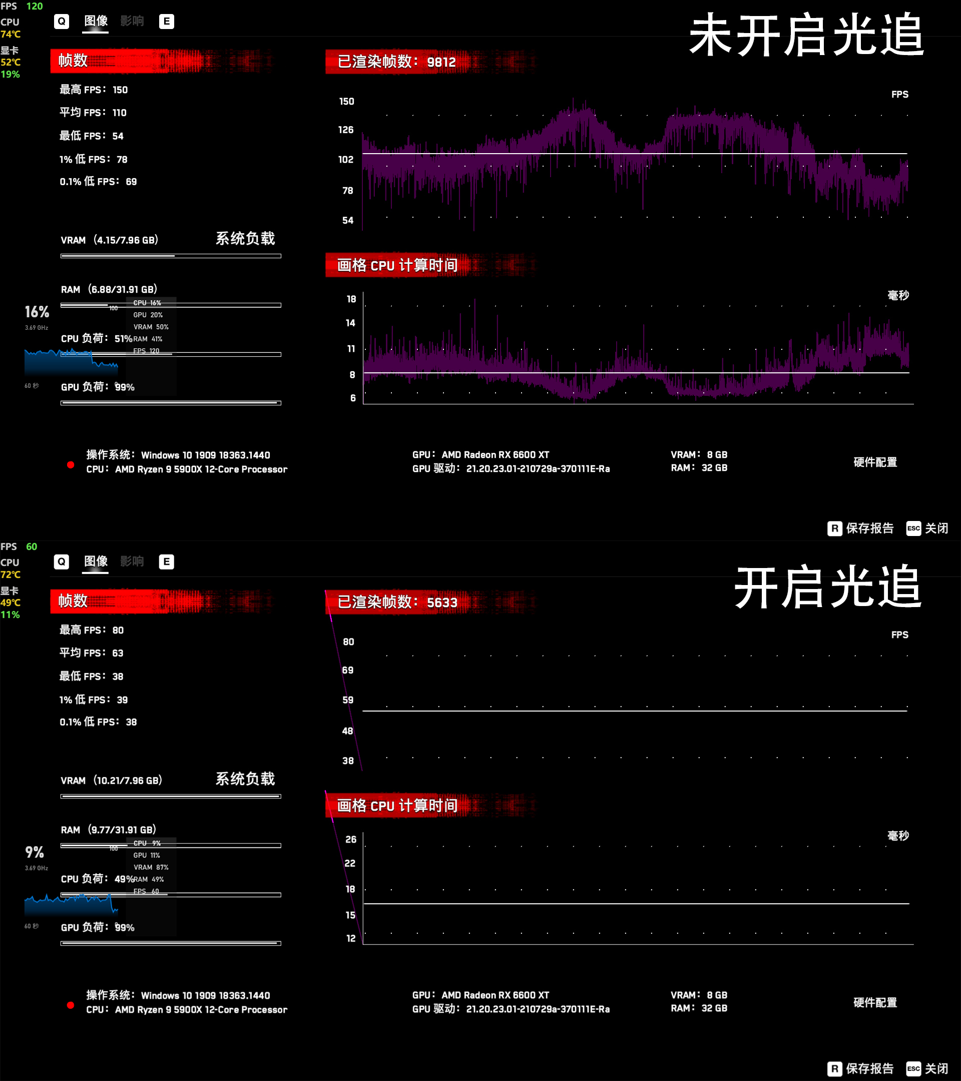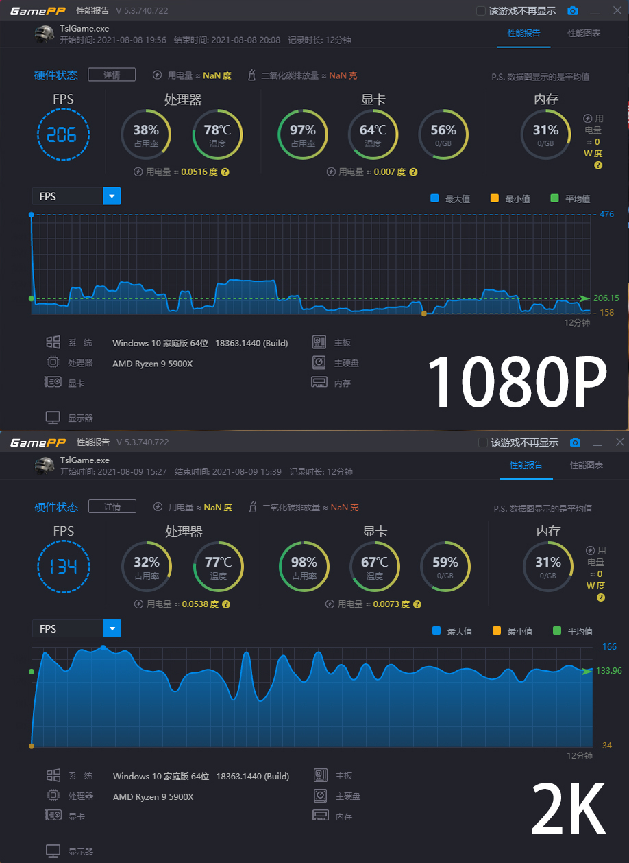 《PUBG》应该是时下最火的一款FPS游戏了,通过实测也可以看到在1080P分辨率下,游戏特效全开进行游戏。游戏加加给出的平均帧数为206 FPS,最低帧数158帧,最高206.15帧的性能报告。开启搭配2K显示器后在2K分辨率在,游戏特效全开进行游戏。游戏加加给出的平均帧数为134 FPS,最低帧数34帧,最高166帧的性能报告。可以说对吃鸡玩家来讲,6600XT在不论2K还是1080P都有着不错的表现,在2K分辨率下134FPS的数据虽然不算耀眼,但是也足够喂饱2K 144Hz的主流电竞显示器的刷新需求了。
